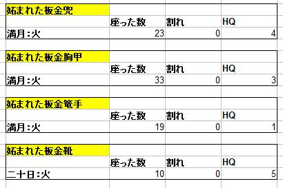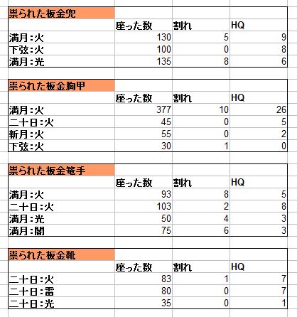 HQ確率がスキル値によって緩やか上がるよう変更がありましたが、胴は1/11/255、頭は1/10/136という結果に。どうやら開発は弄ってはいけないコードを触ってしまったようだ(´;ω;`)